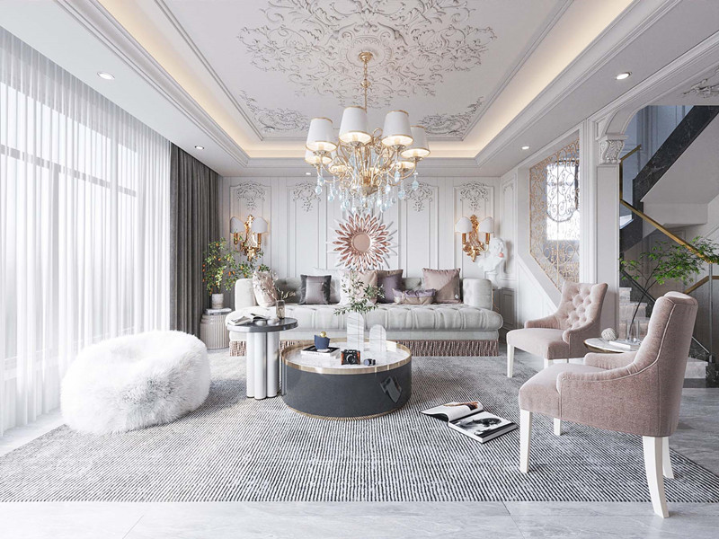 1918美式客厅风格多采用嵌入式石膏吊顶,搭配精美的水晶吊顶,营造出怀旧、浪漫的感觉。